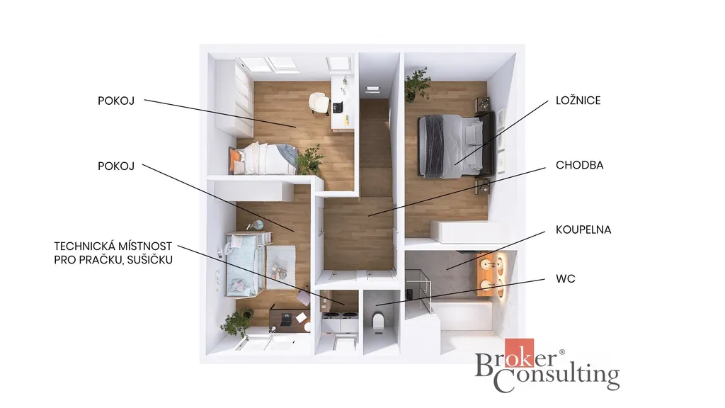 a zahradu, několik samostatných pokojů pro rodinu i práci z domova a další využitelný prostor v podkroví. Parkování pro dvě auta je zajištěno přímo u domu.