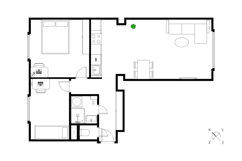 Byt je orientován na jihovýchod a severozápad. Obývací pokoj s kuchyňským koutem směřuje na jihovýchod do klidné ulice, zatímco oba pokoje jsou orientovány na severozápad do zeleného vnitrobloku. Díky této orientaci nabízí dostatek denního světla i příjemné soukromí.