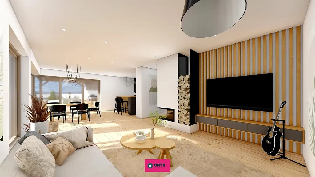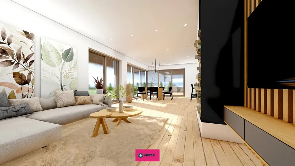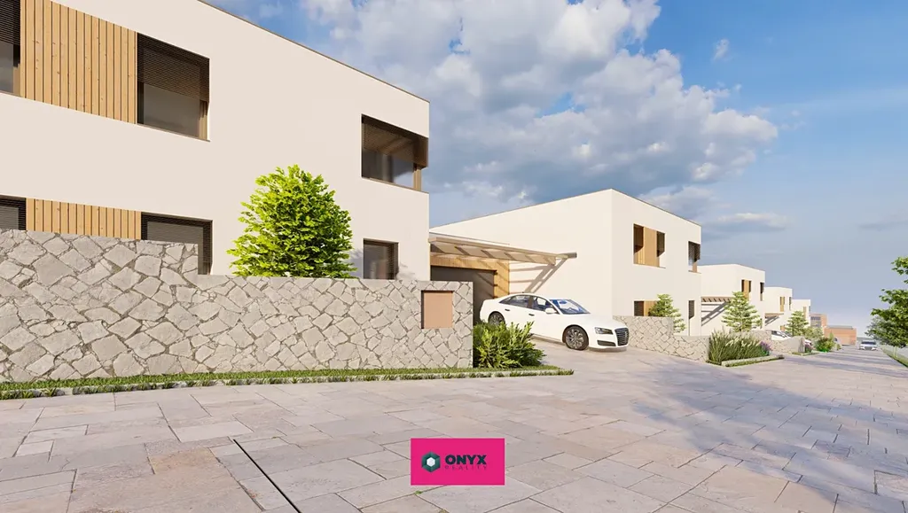 Nabízíme ke koupi velký moderní, nízkoenergetický - ve Třídě A - rodinný dům se dvěma plnohodnotnými podlažími, rovnou střechou a propracovaným dispozičním řešením. Dům disponuje šesti obytnými místnostmi, velkým obytným prostorem (obývací pokoj s kuchyní o velikosti 46 m² s prosklenou stěnou do "L" s přímým vstupem na terasu s HS portálem), třemi koupelnami, třemi toaletami a dvougaráží. Praktickým bonusem je samostatná prádelna s velkým francouzským oknem.