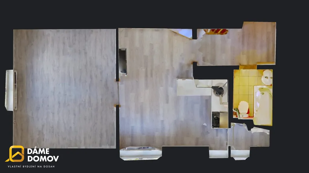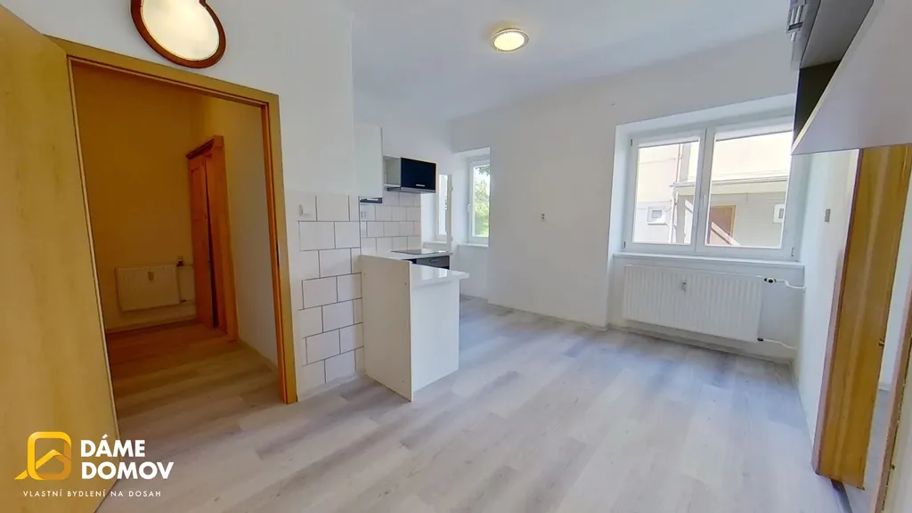 Dispozice: kuchyňský kout spojený s obývací částí, samostatný pokoj, koupelna s vanou a WC. Byt je nezařízený, připravený k nastěhování dle vašich představ.