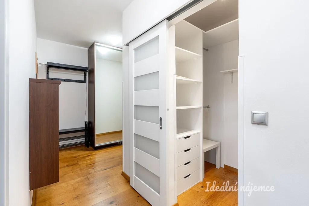Byt má dále dva samostatné pokoje. Jeden je světlý, s oknem, aktuálně vybavený patrovou postelí, dvojicí pracovních stolů, knihovnami a dostatkem úložných prostor. Druhý pokoj, přístupný přes posuvné dveře z obývacího pokoje, slouží jako klidová ložnice – je tichý a nabízí pohodlné spaní i vestavěné úložné prostory. Samostatná šatna výrazně pomáhá udržet byt vzdušný a přehledný. Předsíň je vybavena skříní, botníkem a věšákem, takže odkládání oděvů a obuvi je pohodlné. Koupelna působí prostorně – kromě vany, umyvadla a zrcadla zde najdete praktickou koupelnovou skříňku, pračku a toaletu.