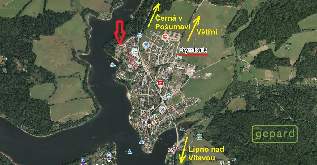 Městys Frymburk – veškeré občanská vybavenost, TOP rekreační a vyhledávaná oblast v ČR, přímo u Lipenského jezera, nezátopová oblast, pohodlné spojení Český Krumlov, České Budějovice, dálnice, atd..