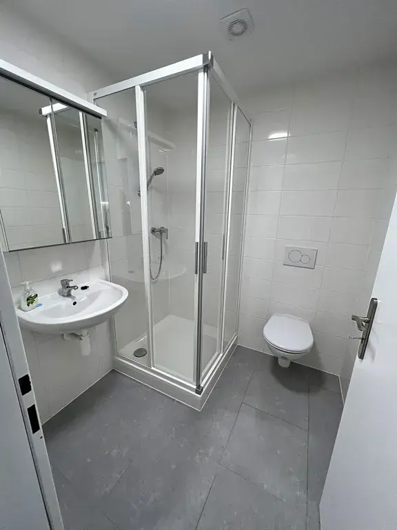Za vstupními dveřmi bytu se nachází menší chodba (cca 3,20 m2), která disponuje prostornou šatní skříní. Po levé straně je koupelna se sprchovým koutem, závěsnou toaletou, umyvadlem, zrcadlovou skříňkou a otopným žebříkem. Koupelna má výměru cca 3,30 m2. Hlavní dominantou bytu je útulný obytný pokoj s kuchyňskou linkou o výměře cca 11,10 m2, který je orientovaný na východ. Kuchyňská linka je vybavena lednicí, dřezem a varnou dvou plotýnkou.