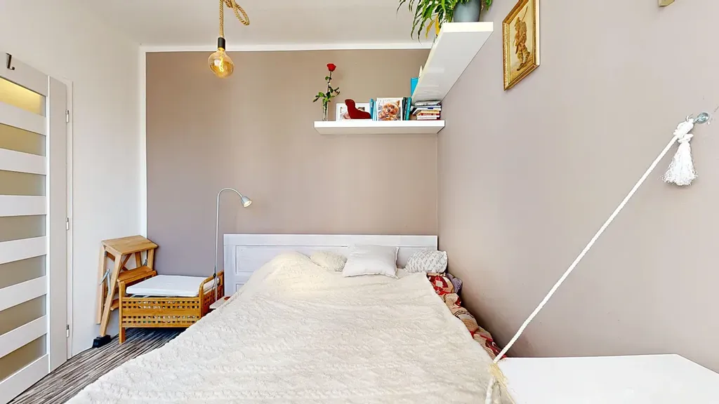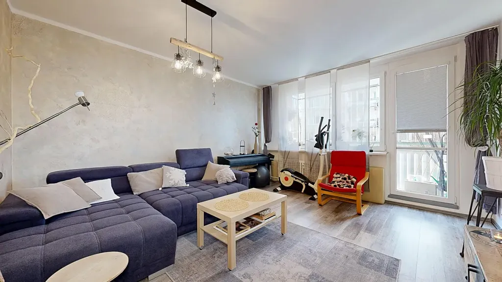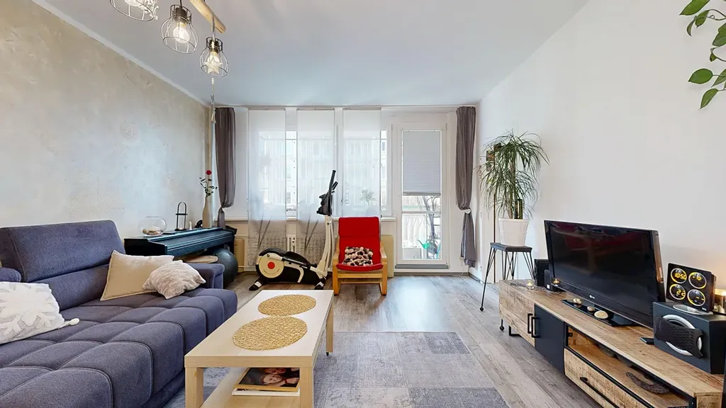 Byt je orientován na jihovýchod, sestává ze samostatné kuchyně (8 m2), obývacího pokoje (18 m2)se vstupem na lodžii, dále ze dvou ložnic (12 m2 a 8 m2),koupelny s vanou a samostatným WC. Přípojku a prostor na pračku naleznete v koupelně. Kuchyň je vybavena vestavnou lednicí, troubou, myčkou, elektrickým sporákem a digestoří. Výhodou bytu je množství vestavných úložných prostor v předsíni. Byt prošel před 5ti lety rekonstrukcí plovoucích podlah.Vytápění je dálkové, ale bytová jednotka má vlastní elektrický bojler na ohřev teplé vody.