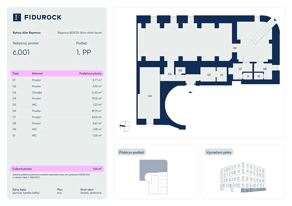 Prostor se nachází v suterénu (I. PP) činžovního domu z 30. let, který právě prochází celkovou rekonstrukcí. V rámci prací bude postupně realizována také nová fasáda. Suterénní část budovy však zůstává ve stejném stavu – nabízený prostor je tedy určen k dokončení dle vlastních potřeb.
