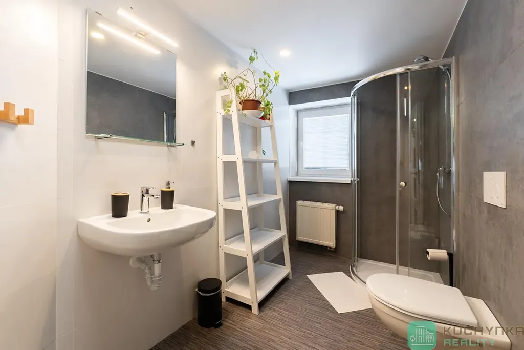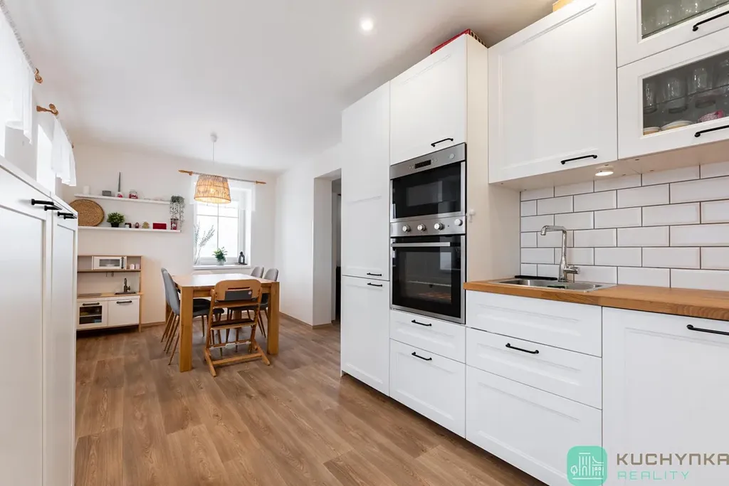 Plně vybavená kuchyňská linka od Ikea s vestavnými spotřebiči, snížené stropy sádrokartonem, vinylové podlahy, teplovodní rozvod s radiátory, v přízemí podlahové vytápění, elektřina v mědi, voda i odpad v plastu, přiznané trámy v podkroví, zateplení obálky domu 12 cm polystyrenem (chybí pouze finální fasáda), izolace střechy 30 cm vata. Prostě povedená rekonstrukce v trendy barvách.