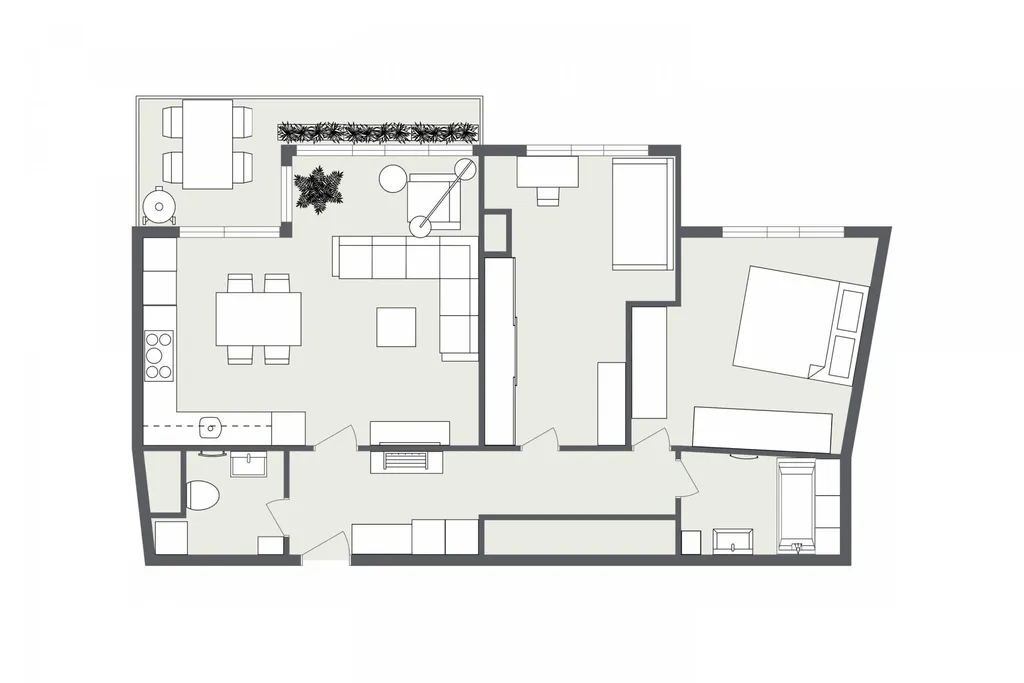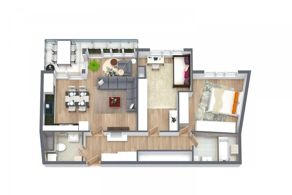 Byt 3+KK o celkové výměře cca 98m2 je dispozičně vhodně rozdělen. Z centrálního pokoje s kuchyní je vstup na prostorný balkon. Do dvou neprůchozích pokojů se dostanete z chodby. Do koupelny stejně tak. WC je od koupelny odděleno, součástí bytu je také parkovací stání a sklep.