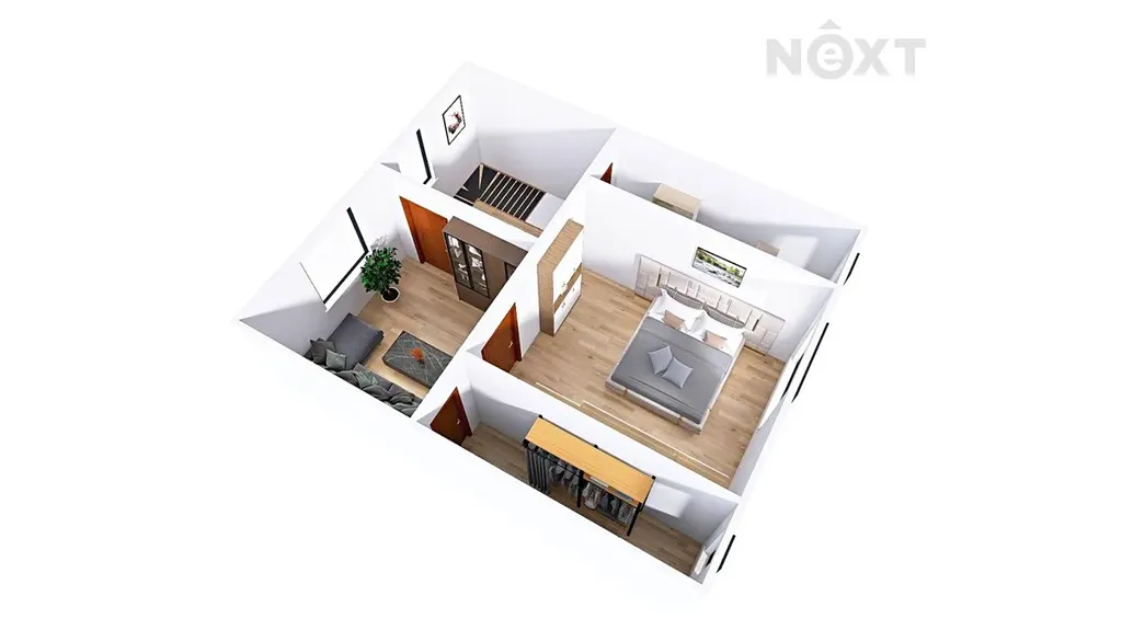 Dřevěné schodiště Vás zavede do druhého nadzemního podlaží, kde se nachází dva pokoje a dvě šatny se spoustou úložného místa. Kdyby Vám ani tohle nestačilo, poslouží k uskladnění dalších věcí půda.