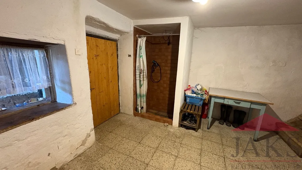 Popis: obytná část: přízemí: zastřešená vstupní veranda, suché WC, chodba (sprchový kout a el. boiler) s dřev. schodištěm do podkroví a sklepa, prostorná sednice (funkční kachlová pec s troubou, dřez, sporák na P.B., kredenc), 2x ložnice (kamna); podkroví: podesta, 2x ložnice; velká půda (vhodná k vestavbě); hospodářská část (vhodná k přestavbě na obytnou část): velký chlév (sklad), velká dřevěná stodola (sklad) s půdou.
