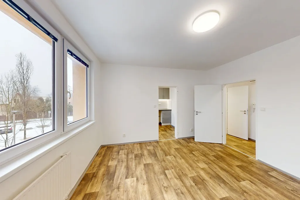 Dispozice bytu zahrnuje centrální obývací pokoj s přístupem do prostorné kuchyně, samostatnou neprůchozí ložnici a předsíň. K bytu náleží sklepní kóje. Byt je momentálně volný, připraven k okamžitému bydlení nebo k pronájmu.