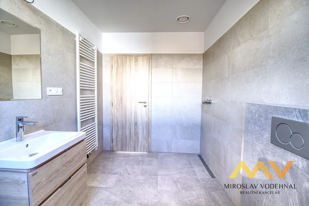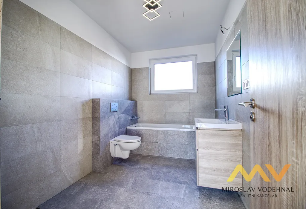 Interiér domu je navržen s důrazem na nadstandardní komfort. Kuchyňská linka na míru je vybavena vestavnými spotřebiči včetně indukční varné desky, elektrické trouby, mikrovlnné trouby, myčky nádobí, odsavače par a americké lednice. V celém domě jsou vinylové podlahy s podlahovým vytápěním napojeným na tepelné čerpadlo vzduch/voda, které zajišťuje nízké provozní náklady a vysoký tepelný komfort. Hliníková okna s elektricky ovládanými venkovními žaluziemi poskytují maximální soukromí a regulaci světla i teploty. Dům disponuje dvěma koupelnami, přičemž obě jsou vybaveny sprchovým koutem a jedna z nich navíc vanou.