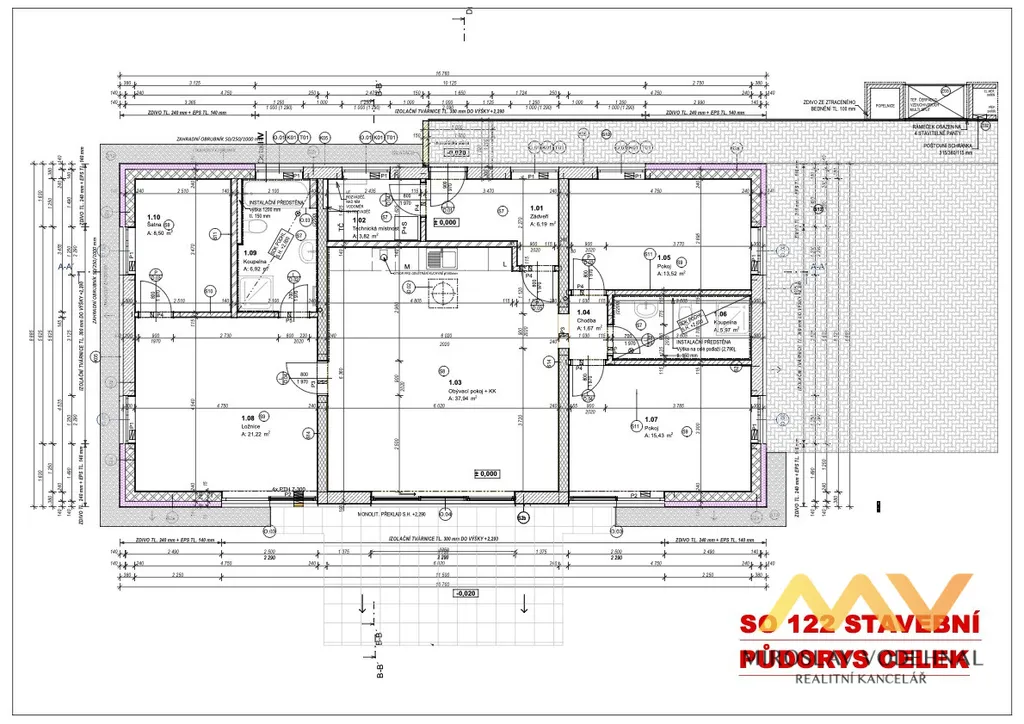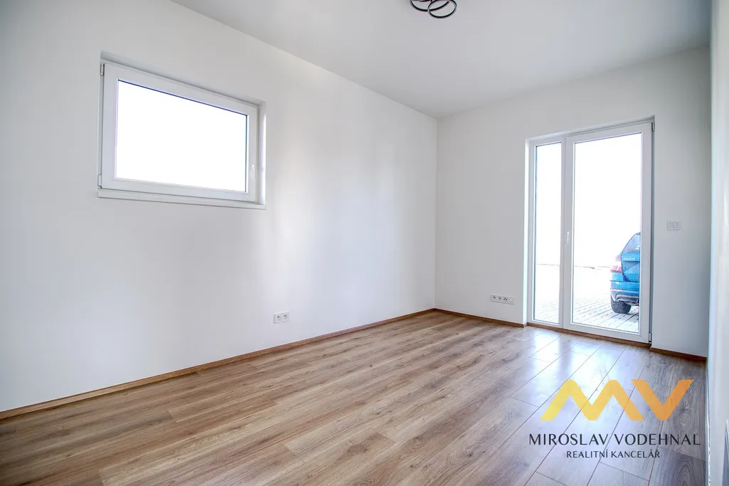 Dominantou domu je velkorysý obývací prostor s kuchyňským koutem o ploše 38 m², který přirozeně navazuje na prostornou terasu a zahradu, čímž vytváří harmonické propojení interiéru s exteriérem. Soukromou část tvoří ložnice o velikosti 21 m² a dva další pokoje (15 m² a 13,5 m²), které mohou sloužit jako dětské pokoje, pracovna či pokoj pro hosty. Praktickým benefitem je samostatná pracovna/šatna o ploše 8,5 m², dvě plnohodnotné koupelny s toaletou, technická místnost a vstupní zádveří.