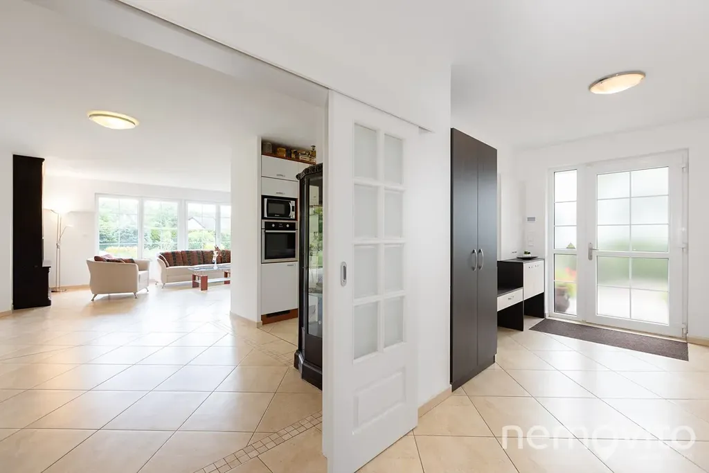 Suterén domu (74 m2) nabízí velkou technickou místnost (jednotka tepelného čerpadla, zásobník na teplou vodu a zázemí k bazénu), dále dva skladovací prostory na chodbě a velkou garáž. Ta je rozdělena na prostor pro auto a dílnu (35 m2), auta však pohodlně zaparkujete na ploše před domem, kam se bez potíží vejde 5 vozů. Velký rovinatý pozemek o velikosti 2.582 m2 je vybaven dvěma studnami a soustavou nádrží na dešťovou vodu. V jeho jižní části se nachází několik vzrostlých stromů a rovněž prostor pro užitkovou část zahrady, která však jinak plní funkci okrasnou.