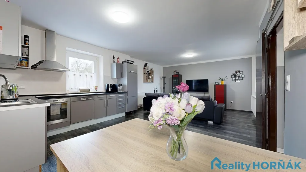 V současné době dům nabízí dispozici 5+KK, rozloženou do přízemí a obytného podkroví. V přízemí jsou situovány místnosti obývacího pokoje s kuchyňským koutem (6,40 x 5,03 = 32,2 m²), ložnice (5,05 x 4,37 = 22,1 m²), pokoj (3,56 x 3,74 = 13,3 m²), koupelna (2,37 x 2,07 = 4,9 m²), samostatné WC (1,52 x 1,52 = 2,3 m²). Dispozici přízemí doplňují místnosti vstupní chodby (3,74 x 2,55 = cca 9,5 m²), navazující komunikační část chodby (3,69 x 1,42 = cca 5,2 m²) a komora (1,33 x 1,44 = 1,9 m²). Po pohodlném schodišti vystoupáme do podkroví se komunikační chodbičkou (3,69 x 2,42 = cca 8,9 m²) a dvěma pokoji (3,69 x 4,63 = 17,1 m² a 3,69 x 4,54 = 16,8 m²). V mezipatře je vybudováno samostatné WC (1,42 x 1,46 = cca 2,1 m²). Dispozici podkroví lze případně dále rozvíjet do dosud nevyužitého půdního prostoru (3,69 x 6,74 = cca 24,9 m²). Rodinný dům dále nabízí dvě sklepní místnosti (8,30 x 1,54 = 15,4 m² a 2,30 x 5,12 = 12,6 m²). Potravinový sklep je přístupný z chodby, technický sklep ze dvora. Uvedené výměry místností vycházejí z dostupných půdorysných podkladů a z měření v rámci 3D skenu nemovitosti. Jedná se o orientační údaje sloužící pro základní přehled o dispozici; přesné výměry se mohou v drobných odchylkách lišit. Obvodovou konstrukci domu tvoří smíšené, převážně cihelné zdivo. Okenní otvory jsou osazeny plastovými okny s izolačním dvojsklem. Fasáda není zateplena. Dům kryje nová střešní krytina, položená na původním krovu. Obytné místnosti podkroví jsou zatepleny skelnou vatou. V přízemí jsou převážně betonové podlahy, kryté linem, v části jsou původní dřevěné podlahy překryté OSB deskami a opět linem. V podkroví jsou betonové podlahy, kryté linem, anebo keramickou dlažbou. V rámci modernizace domu byly provedeny nové rozvody elektřiny (měděné vodiče). Rozvody vody a odpadů jsou nové, provedené v plastu. Vodou je dům zásobován z vlastní kopané studny o hloubce cca 8–9 m. Odpady jsou svedeny do septiku s následným trativodem do pole. Vytápění je řešeno teplovodním ústředním systémem (radiátory) napojeným na tepelné čerpadlo vzduch–voda. Ohřev teplé vody zajišťuje elektrický bojler.