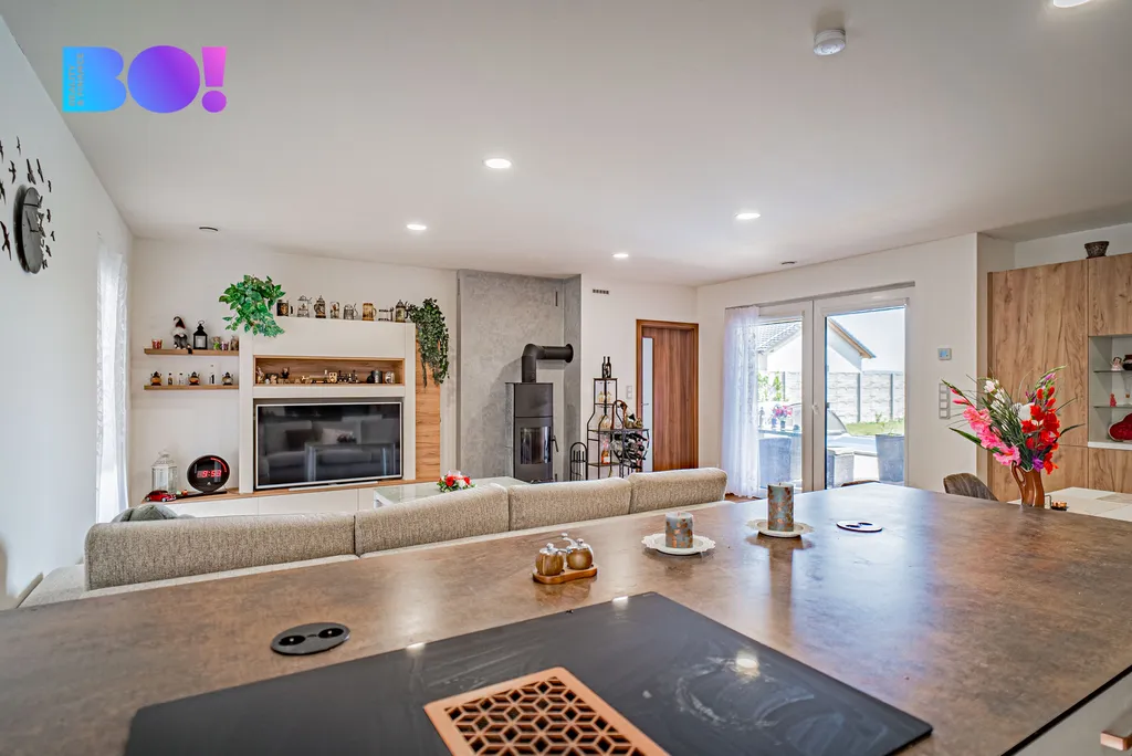 Dominantou domu je velkorysý obývací prostor s kuchyní, který tvoří přirozené srdce celého domu. Kuchyň je vybavena novou moderní kuchyňskou linkou se spotřebiči a nabízí dostatek prostoru pro vaření i společné chvíle s rodinou či přáteli.