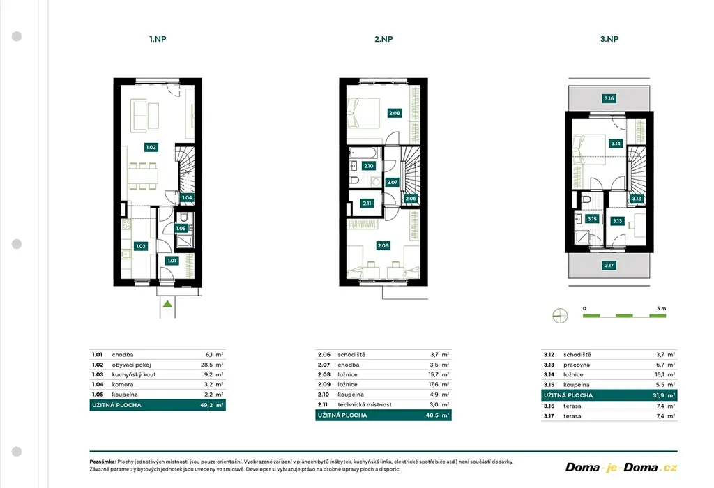 Součástí nabídky je také 6 třípodlažních řadových rodinných domů o dispozici 4+kk + pracovna. Každý řadový dům nabízí 129,6 m² obytné plochy, zahradu a dvě terasy. Promyšlené uspořádání zahrnuje tři koupelny, komory i samostatnou technickou místnost. Parkování je řešeno jedním až dvěma venkovními stáními přímo u domu.
