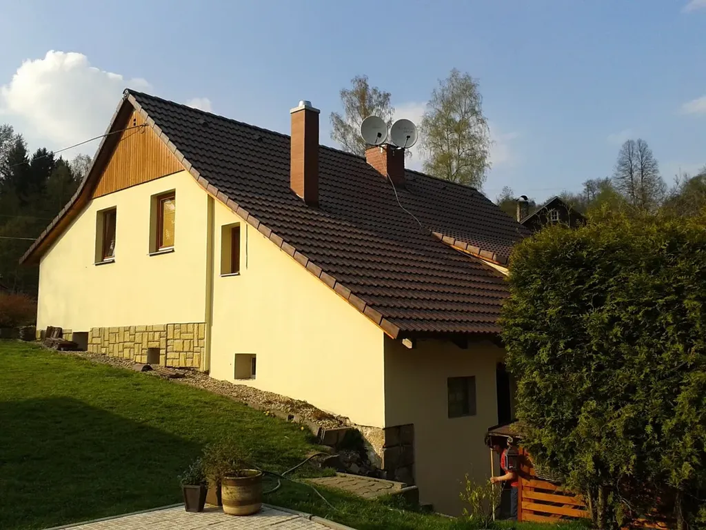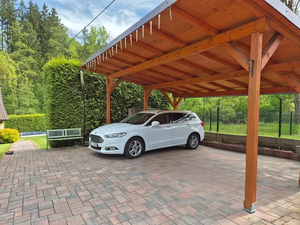 Technické informace: dům je zděný (tloušťka zdiva 45 cm) s fasádou, okna dřevěná Euro, střešní krytina betonová taška, vytápění elektrokotlem nebo kotlem na dřevěné pelety, TUV elektrický bojler, kanalizace svedena do septiku, voda z vlastní studny. Vedlejší stavby: pergola s posezením, bazén, pergola na parkování aut, 2 zahradní domky. Pozemek je oplocený, brána na dálkové ovládání. Zahrada je terasovitá, místy svažitá k regulovanému potoku, udržovaná s celodenním osluněním.