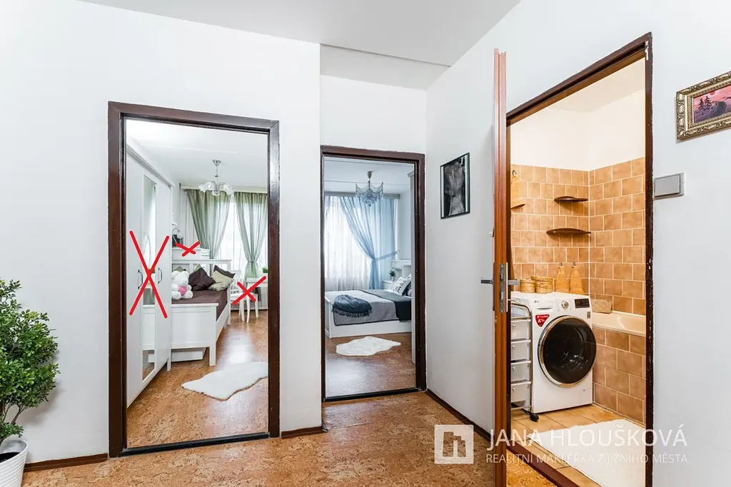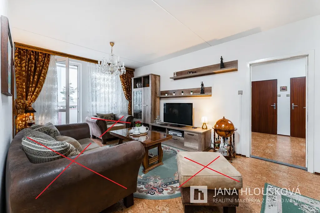 Dispoziční uspořádání bytu je patrné z přiloženého kótovaného 2D půdorysu a možné rozložení nábytku je vidět na přiloženém 3D půdorysu. Byt je částečně vybaven, viz. foto (přeškrtnuté vybavení v bytě není).