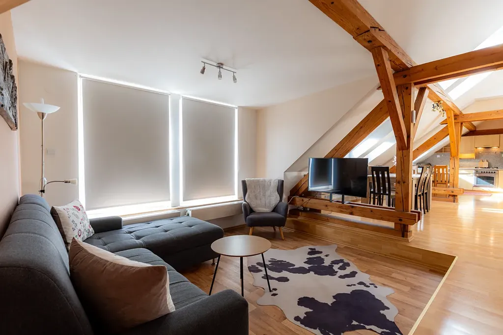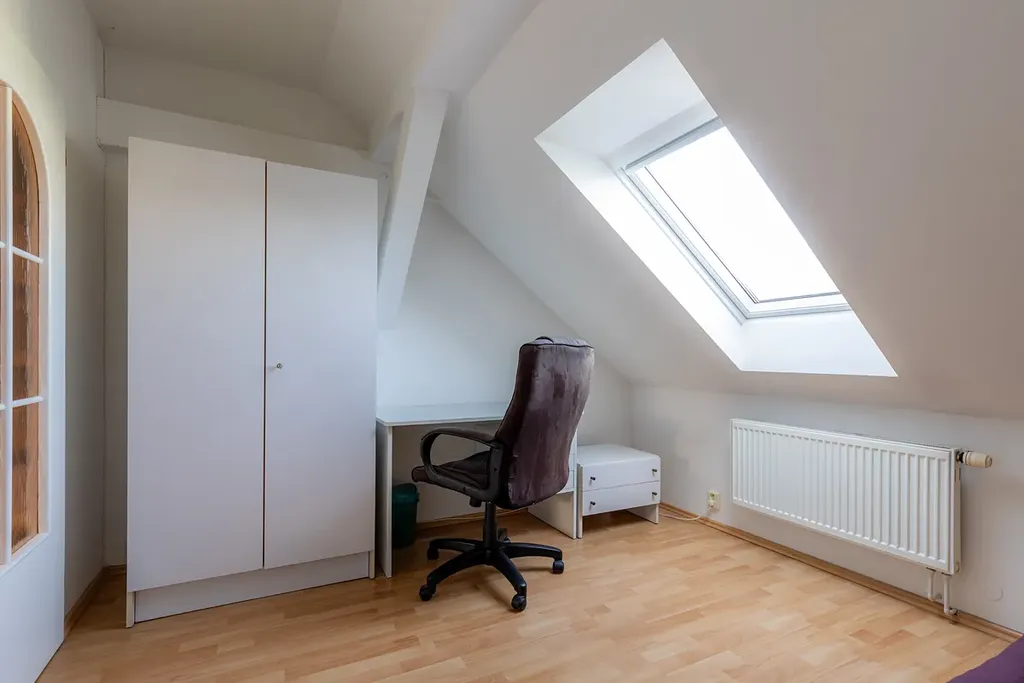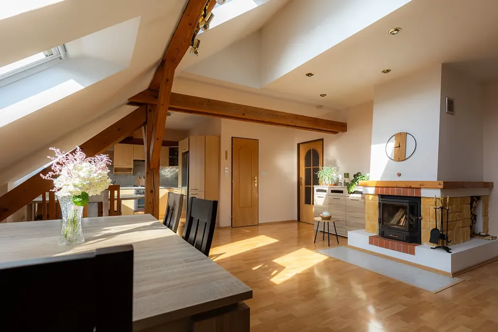 Tato nemovitost zaujme především svou velkorysostí, vzdušností a variabilitou. Srdcem bytu je impozantní otevřený prostor propojující kuchyni, jídelnu a obytnou halu – místo, které přirozeně spojuje rodinu i přátele. Atmosféru zde podtrhuje krb a dostatek denního světla díky kvalitním střešním oknům, která jsou na jižní straně doplněná žaluziemi. Komfort v letních měsících zajišťuje klimatizace.