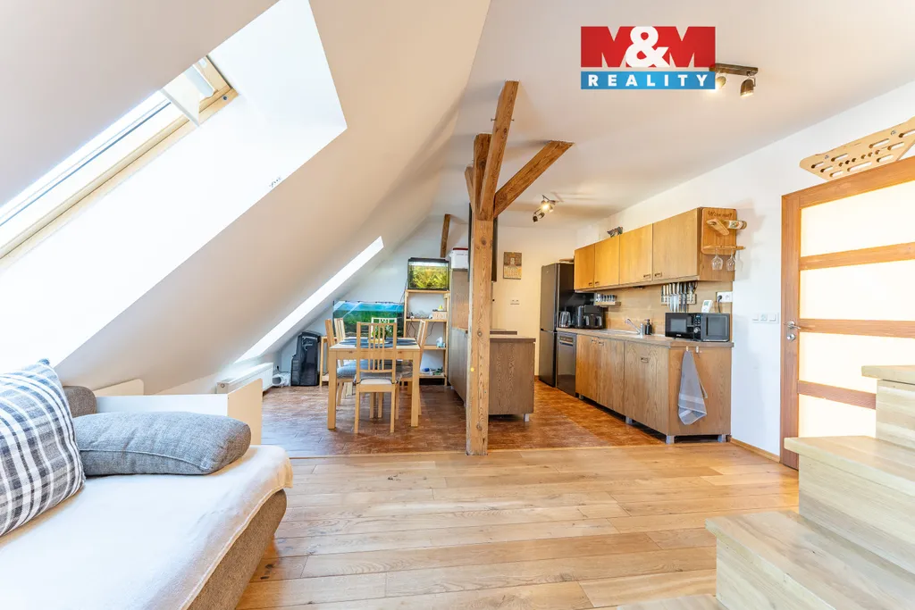 Dispozice bytu je velmi praktická. Ve spodní části se nachází prostorná chodba, koupelna, obytná místnost s kuchyňským koutem a další samostatný pokoj. V horním patře je místnost se střešním oknem a úložným prostorem a dále otevřený prostor s možností vytvoření příčky, čímž lze byt snadno upravit na dispozici 4+kk. Z tohoto prostoru je vstup na terasu s krásným výhledem.