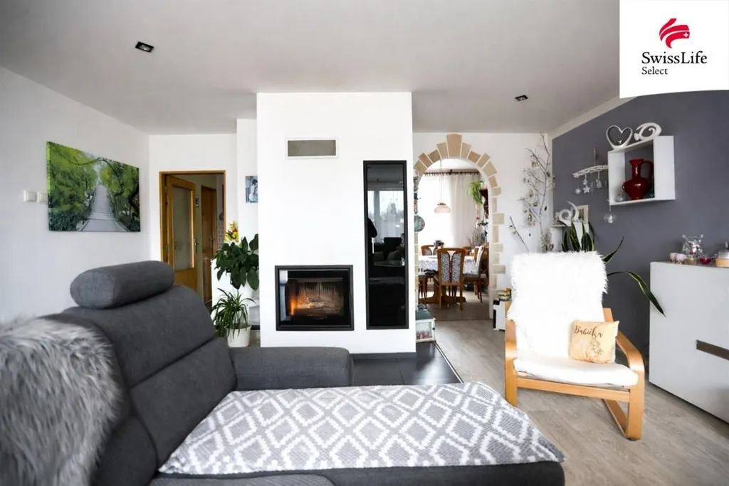 Mezonetový byt (95 m) světlý a prostorný interiér s dominantním krbem, který dokáže vytopit téměř celý byt.