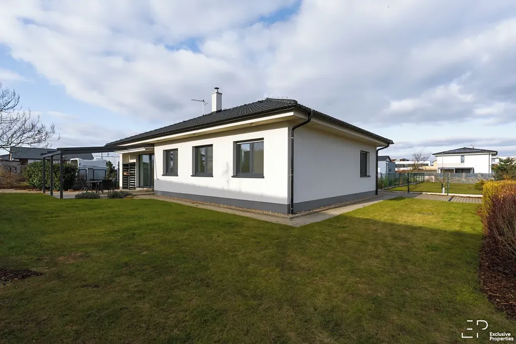 Výměra pozemku je 1056 m2. Podlahová plocha domu je 119 m2. Dispozice 5+kk. Orientace pobytové části zahrady JZ, Z. Prostorná terasa s posuvným zastřešením a zahradním nábytkem. Založená a udržovaná zahrada s automatickou závlahou, skleníkem a trampolínou. Případně po dohodě k využití nadzemní bazén.