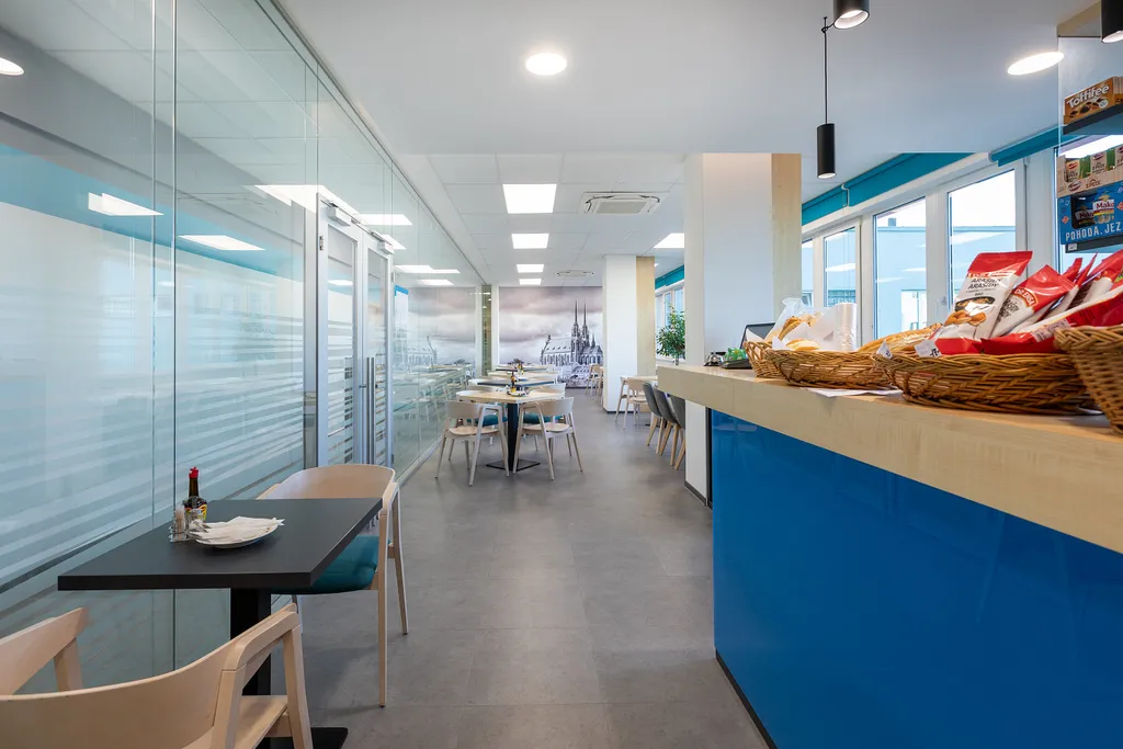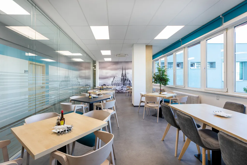 Vybavení kanceláří: klimatizace, zátěžové koberce, žaluzie, centrální topení, strukturovaná kabeláž, PC síť, dostatek tel. linek, připojení k datové síti vysokou rychlostí.