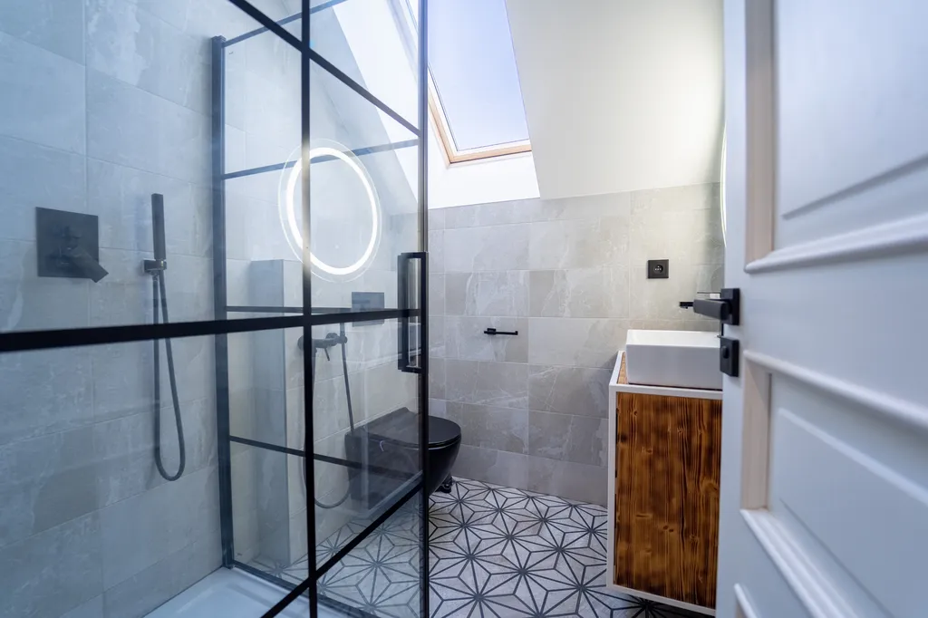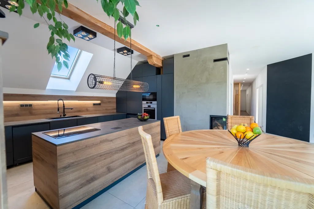 • V 1. patře se nachází prostorný moderní byt s podlahovým vytápěním, dispozicí 6+KK o výměře 200 m² se dvěma koupelnami.
