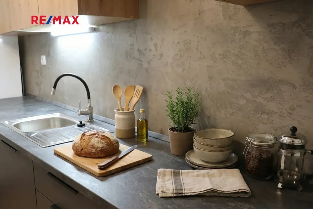 Kuchyně, která má styl: Nová linka v kombinaci černé a dekoru dřeva s designovou šedou stěrkou. Tady bude radost připravovat ranní espresso i večeři pro přátele.