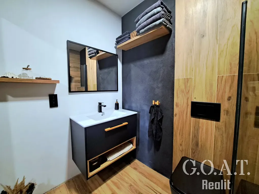 Ve spodním patře se nachází technická místnost s pračkou a sušičkou, což Vám usnadní péči o domácnost. Jedna koupelna je v přízemí a je vybavena sprchovým koutem a toaletou.