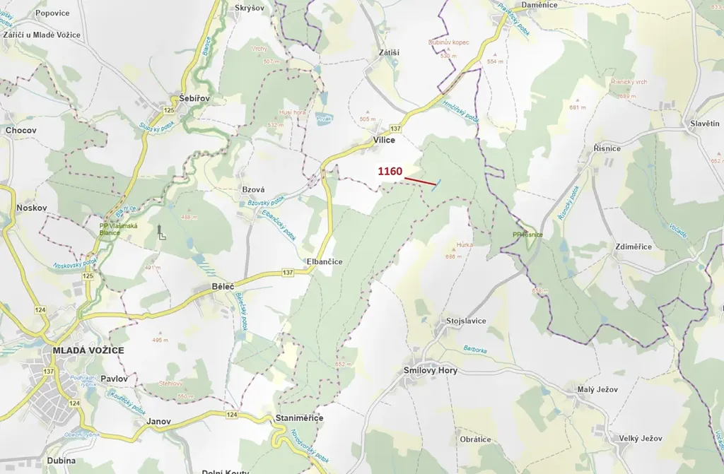 Lesní pozemek o výměře 2693 m2, parcelní číslo 1160, podíl 1/1, katastrální území Vilice, obec Vilice, obec s rozšířenou působností Tábor, okres Tábor, Jihočeský kraj. Po těžbě.