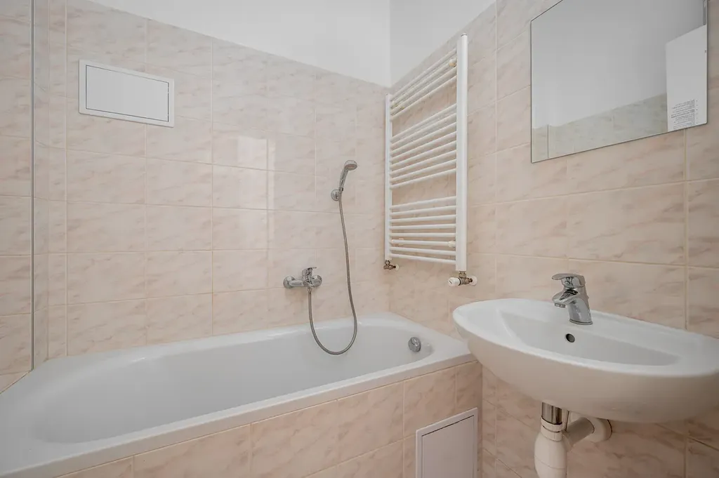 Příjemný byt o velikosti 2+1 v činžovním domě v samém centru Prahy nabízí na 57 m2 prostorný obývací pokoj, ložnici, kuchyň zařízenou kuchyňskou linkou se spotřebiči a místností na potraviny, koupelnu s vanou a separátní toaletu.