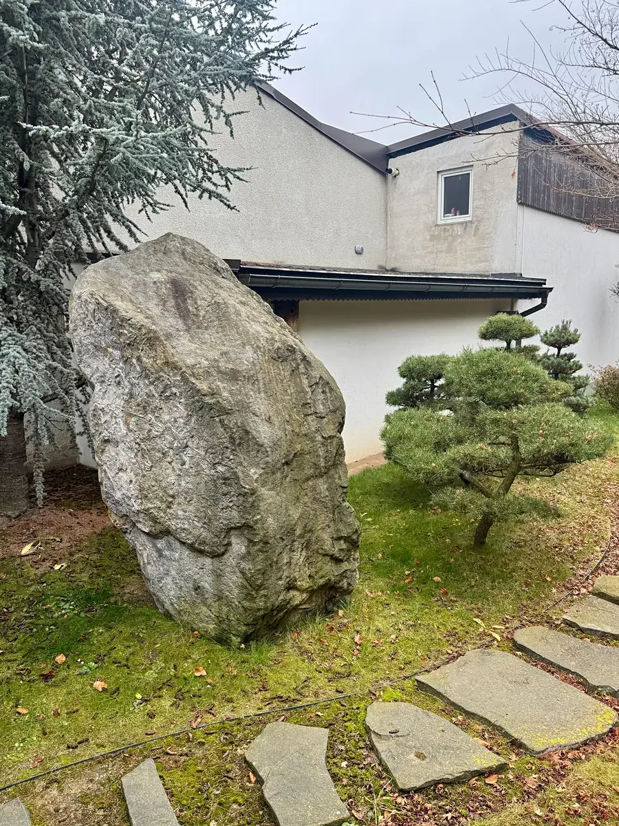Zahrada v pojetí feng-shui nabízí prostor pro relaxaci a odpočinek. Nalezneme zde zastřešené sezení, ohniště, dřevník a studnu. Dominantu zahrady tvoří jezírko s celoroční filtrací pro okrasné japonské ryby kapr koi.