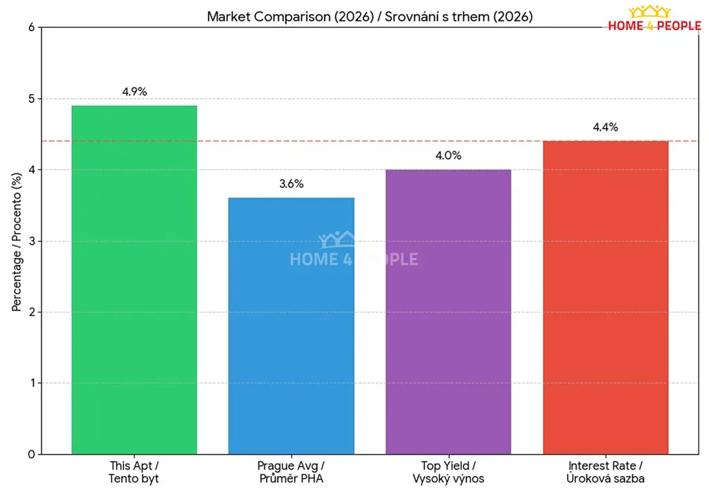 Nadstandardní výnos z pronájmu: Silný výnos 4,9 %, který výrazně převyšuje průměr pražského trhu (3,6 %) i aktuální úrokové sazby hypoték (4,4 %).