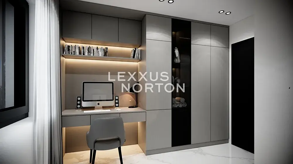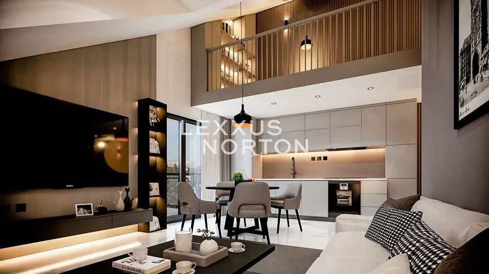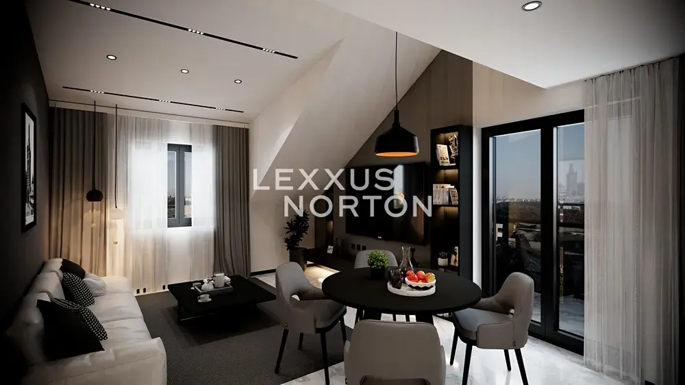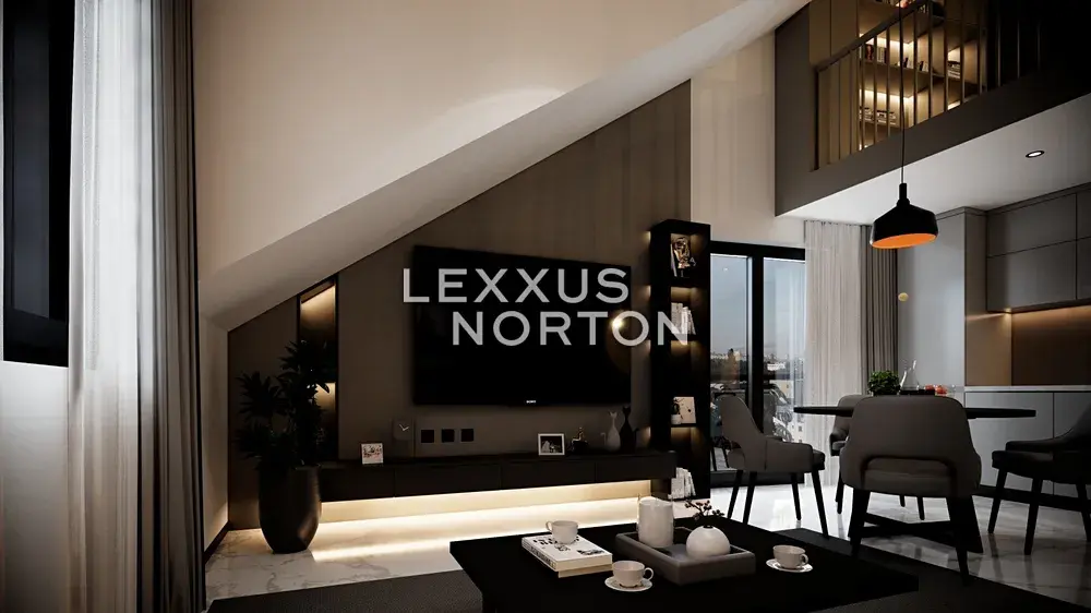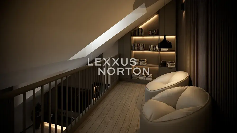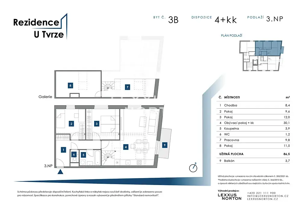 Prostorný obývací pokoj propojený s kuchyňským koutem poskytuje přímý vstup na balkon i schodiště k horní galerii. V dolní části se nachází dvě ložnice, koupelna s vanou a samostatné WC. Horní část doplňuje galerie s dalším pokojem a pracovnou, která se snadno přizpůsobí vašim potřebám.