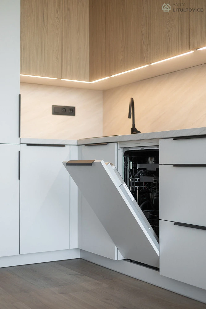 Obytná část je příjemně prosvětlena a disponuje zcela novou kvalitní kuchyňskou linkou na míru. Ta nabízí dostatek pracovního i úložného místa a je vybavena troubou, indukční varnou deskou, myčkou a lednicí. Součástí bytu je pokoj určený ke spaní, který poskytuje příjemné a klidné zázemí. Vstupní chodba dává prostor pro vestavěné skříně nebo další úložné řešení podle vlastních představ.