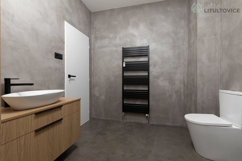 Prostorná koupelna je řešena moderně, s betonovou stěrkou, sprchovým koutem a nábytkem na míru, který umožňuje pohodlnou a přehlednou organizaci věcí.