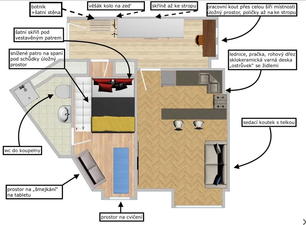 - oddělený pracovní kout a úložné prostory v předsíni.