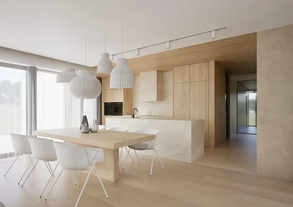 Přízemí domu tvoří velkorysý obytný prostor o výměře 109 m², který přirozeně propojuje obývací pokoj, jídelnu a kuchyň. Na tuto část plynule navazuje samostatná posilovna a relaxační zóna se saunou, citlivě oddělená pro zachování soukromí. Dále se zde nachází samostatná toaleta, praktická spíž, technická místnost a prostorná vstupní hala s přímým vstupem z garáže i z exteriéru.