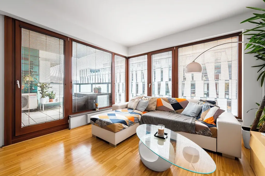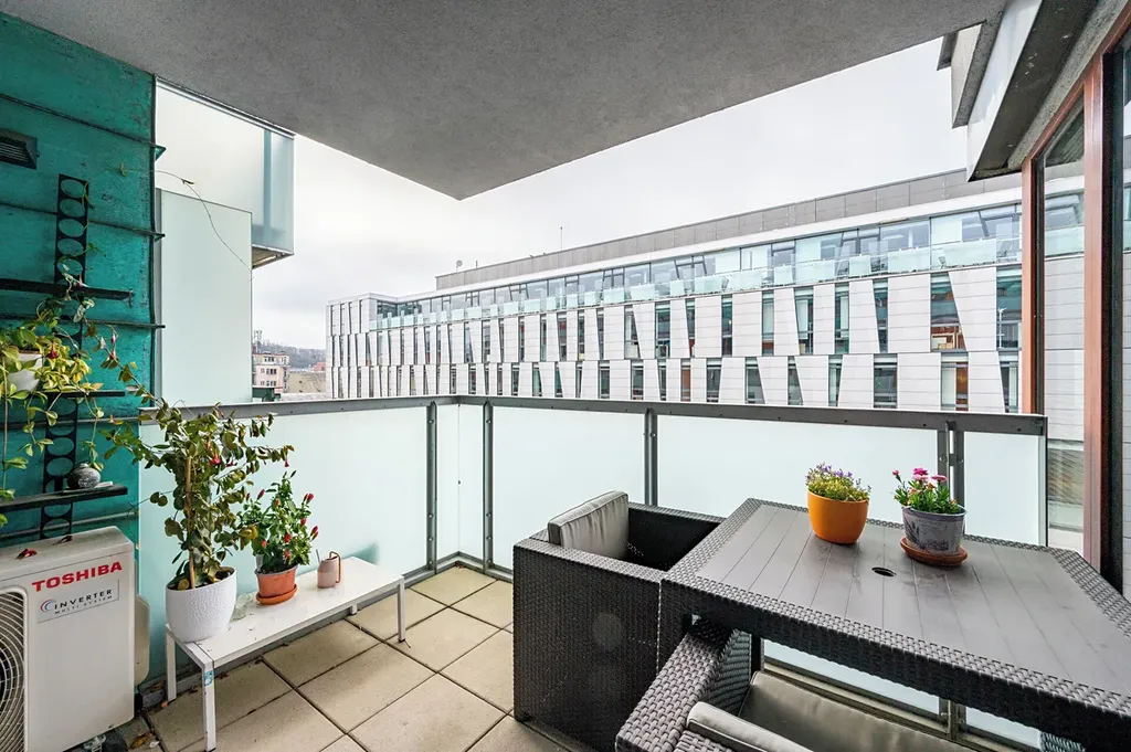 K pronájmu krásný byt 2+kk 60 m2 s terasou 7 m2, včetně garážového stání a sklepa 4 m2, v luxusní rezidenci River Diamond, přímo v atraktivní lokalitě Karlín na Rohanském nábřeží.