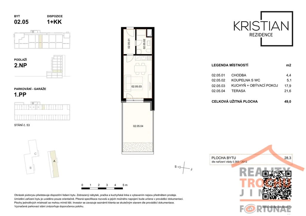 Nabízíme k pronájmu nový byt v Rezidenci Kristian o dispozici 1+kk, ve vyhledávané lokalitě v Hradci Králové – Moravské Předměstí. Byt se nachází ve 2. patře zděného domu s výtahem. Celková plocha bytu činí 49 m² (včetně terasy 21,6 m²).