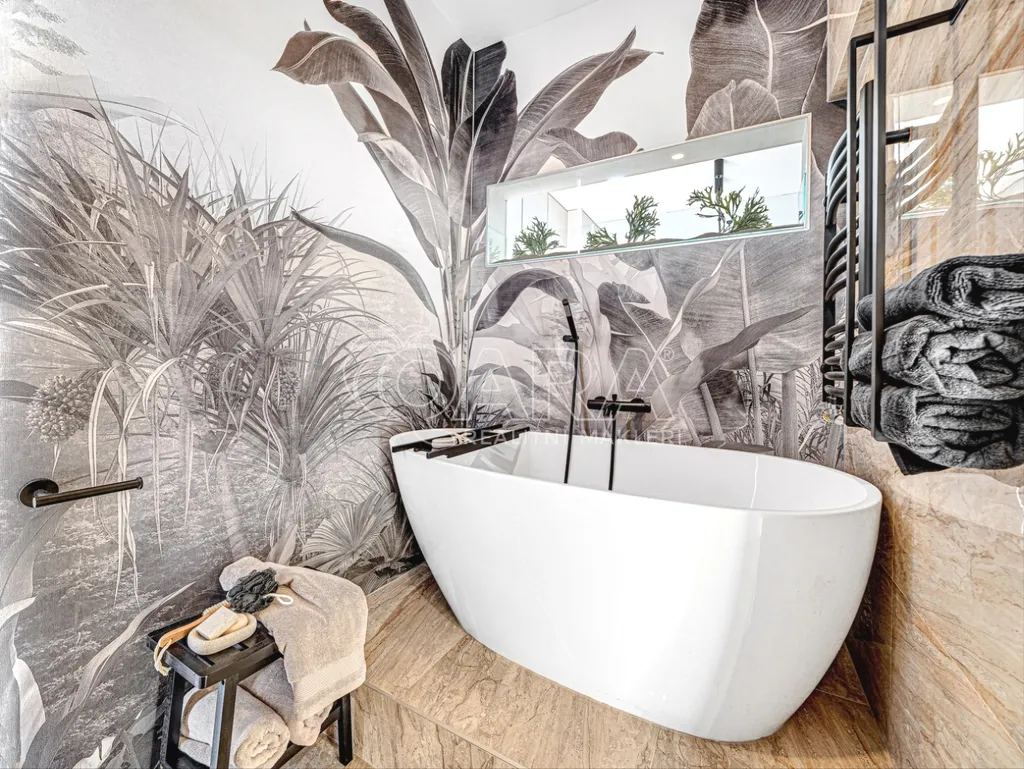 V koupelně najdete moderní vanu, elegantní kombinaci dlaždic a světla, která působí mimořádně útulně. Vše v jednotném designu a bez kompromisů v kvalitě.