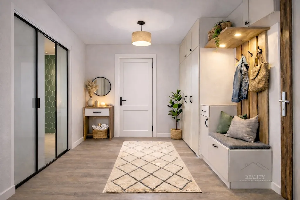 Součástí prezentace jsou také vizualizace znázorňující možnou budoucí podobu interiéru, které pomáhají lépe představit potenciál této nemovitosti.