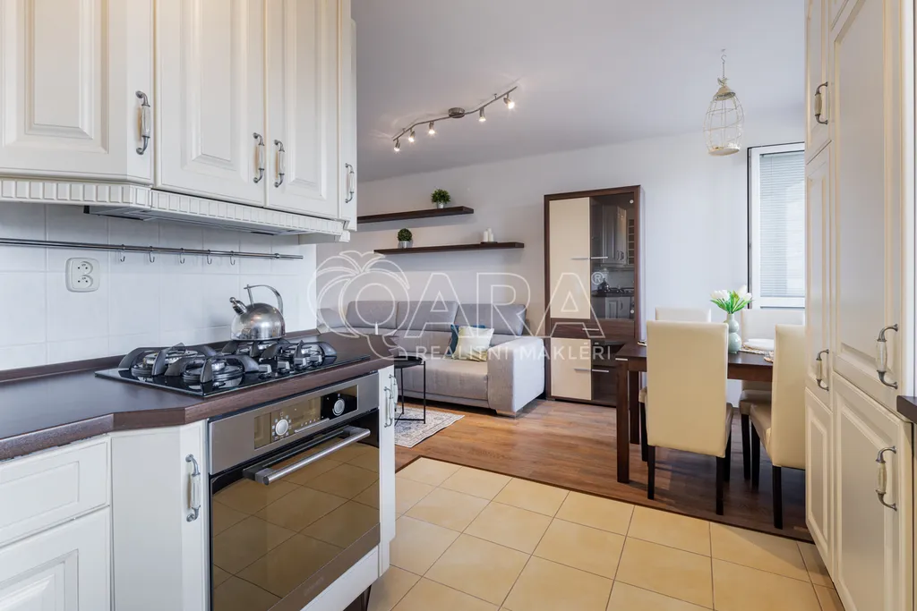 Dominantou bytu je pohodlná obývací část s plně vybavenou kuchyní v provensálském stylu orientována na západ.