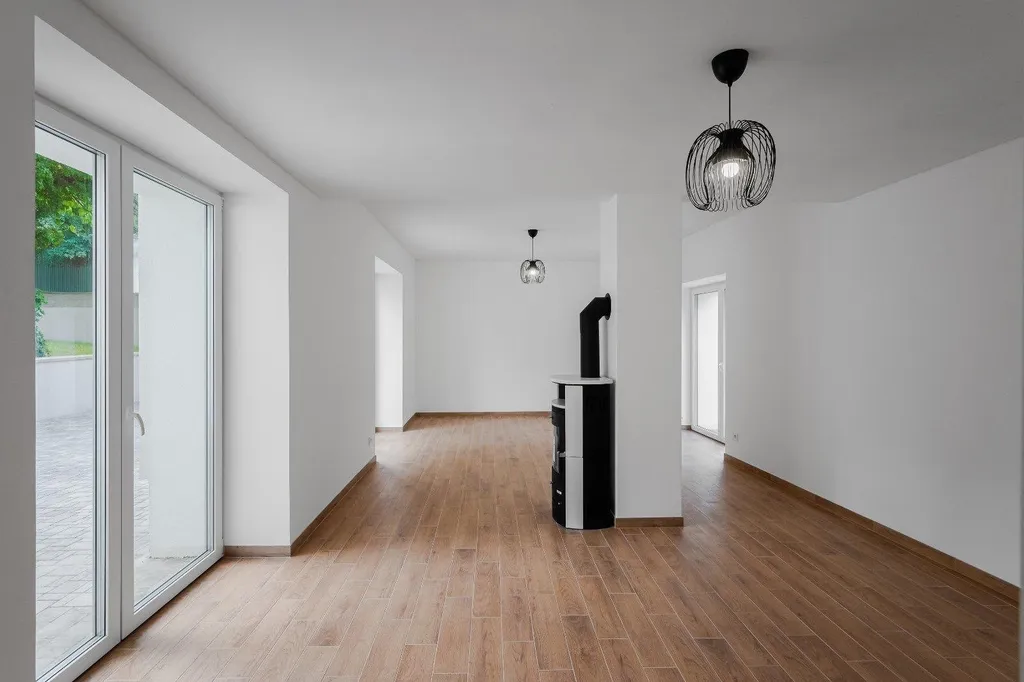 Prostorný a světlý obývací pokoj s francouzskými okny a přímým vstupem na obě terasy