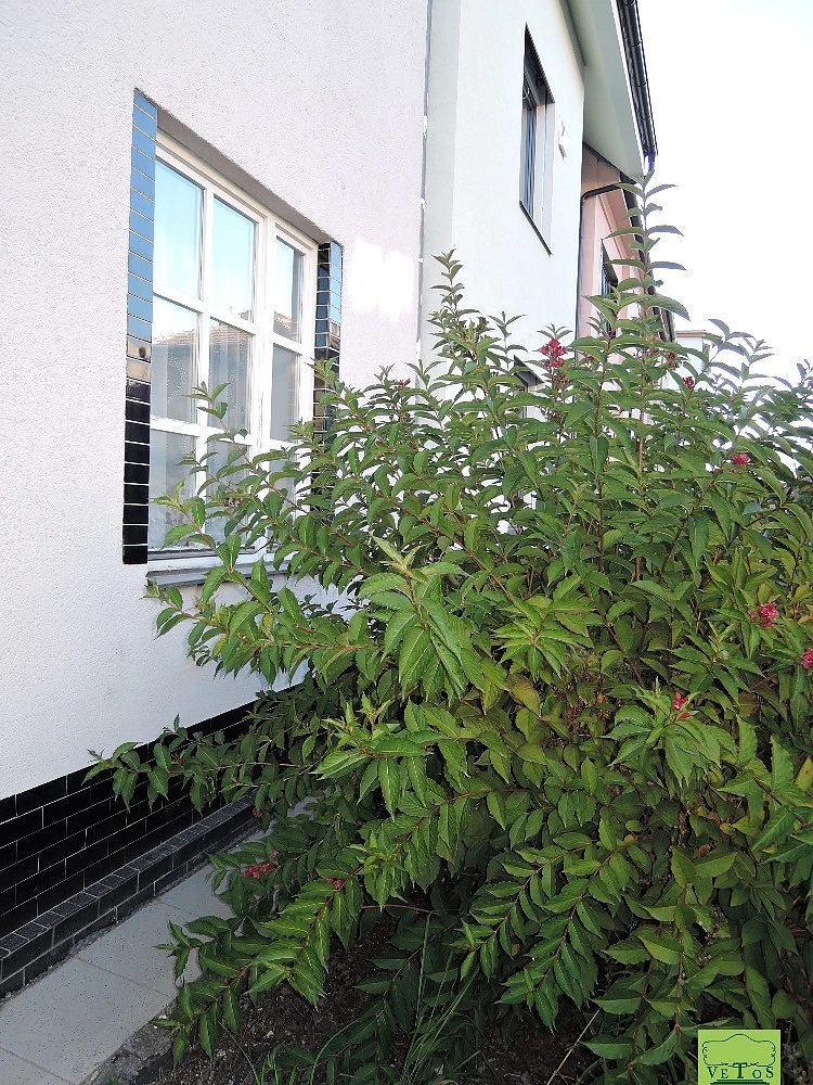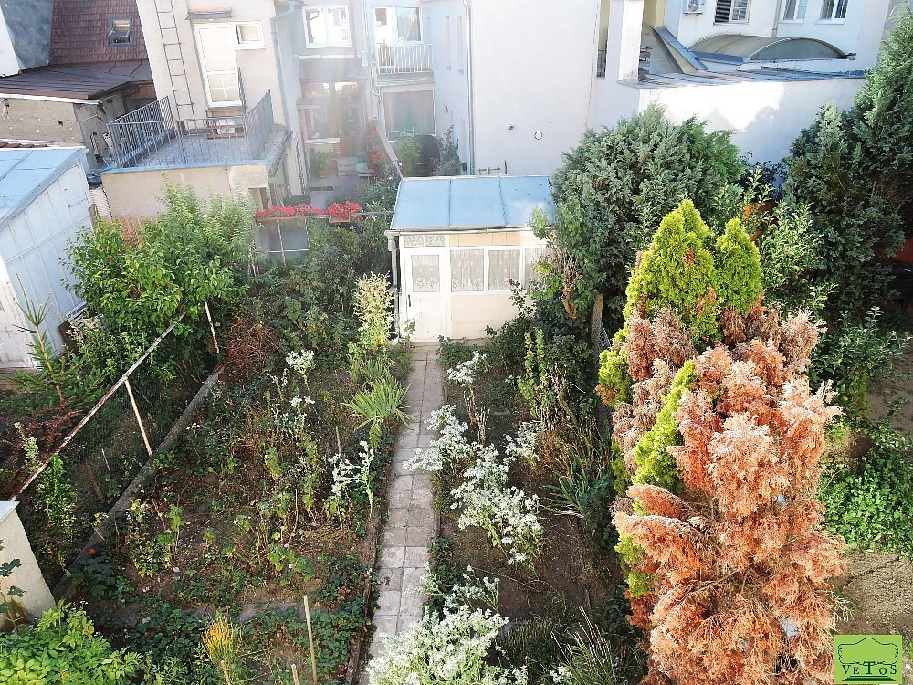 Vstup do chodby, z níž jsou vstupy do pokoje v přízemí, s výhledem do předzahrádky, do kuchyně s výhledem do vlastní zahrady, vstup do spižírny, WC, a dále po několika schodech dolů vstupujeme na terasu, na niž navazuje vlastní zahrada se zahradním domkem. Vedle dveří na terasu je vstup po schodech do rozměrné koupelny v suterénu se sprchou i vanou a sekčními prostory pro pračku, kotel na ohřev teplé vody a plynový kotel. Nelze zapomínat také na 2 sklepní prostory.