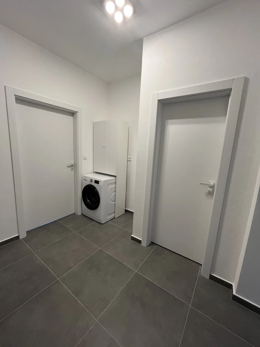 Dispozice nabízí koupelnu s umyvadlem, sprchovým koutem, vysokými skříňkami jako vhodný úložný prostor a toaletu. Na chodbě se nachází šatní skříň sloužící k ukládání bund a obuvi.