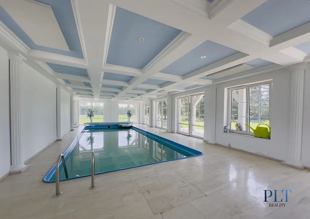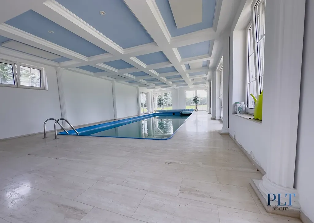 • 1.NP hlavní části (333,85 m²): vstupní hala, 3 obývací pokoje, jídelna, kuchyně se spíží, šatna, 2x WC, bazén, sauna, šatna k bazénu.