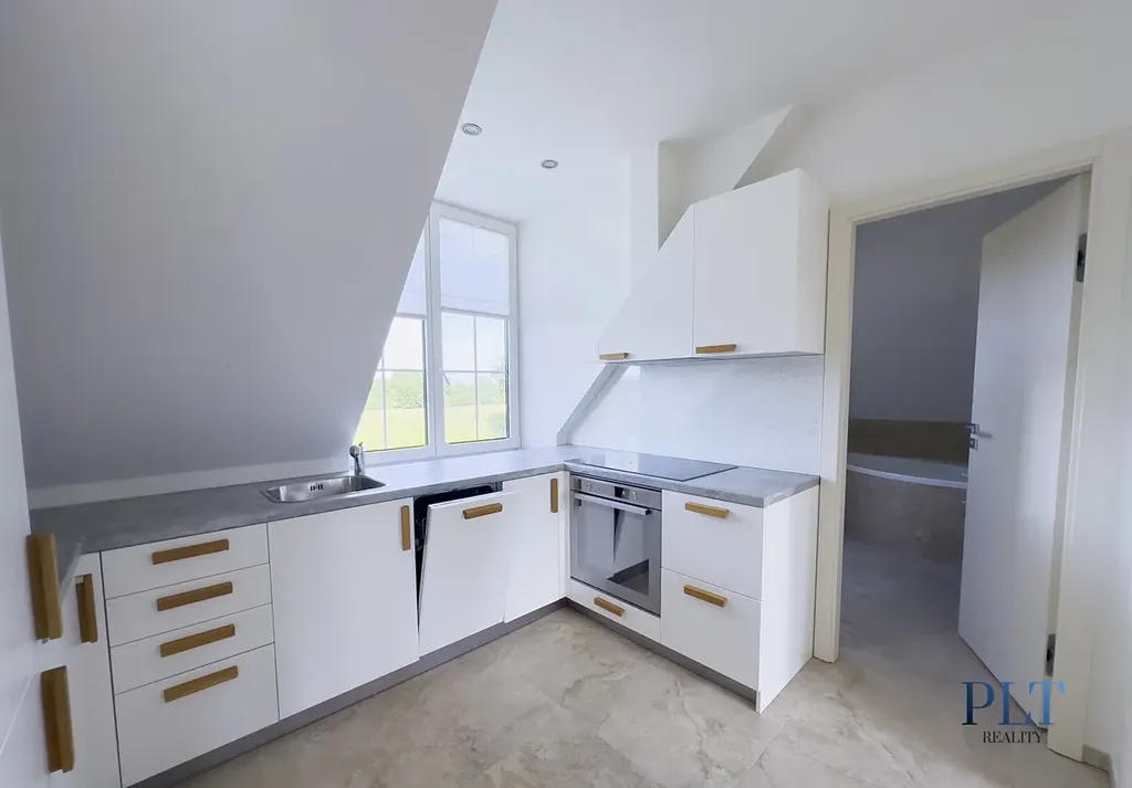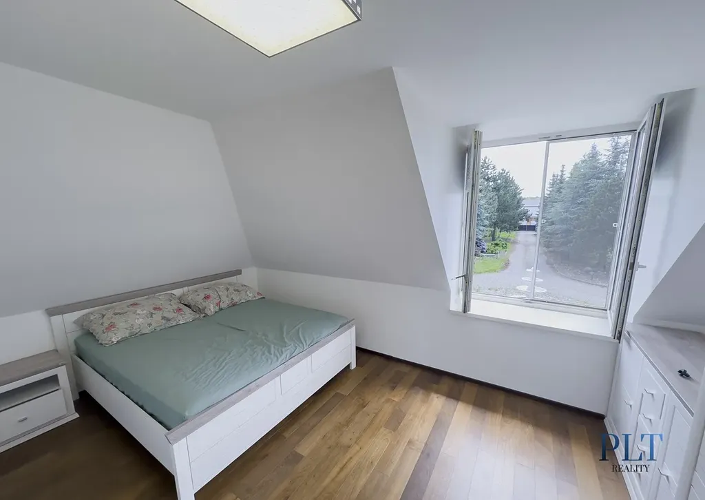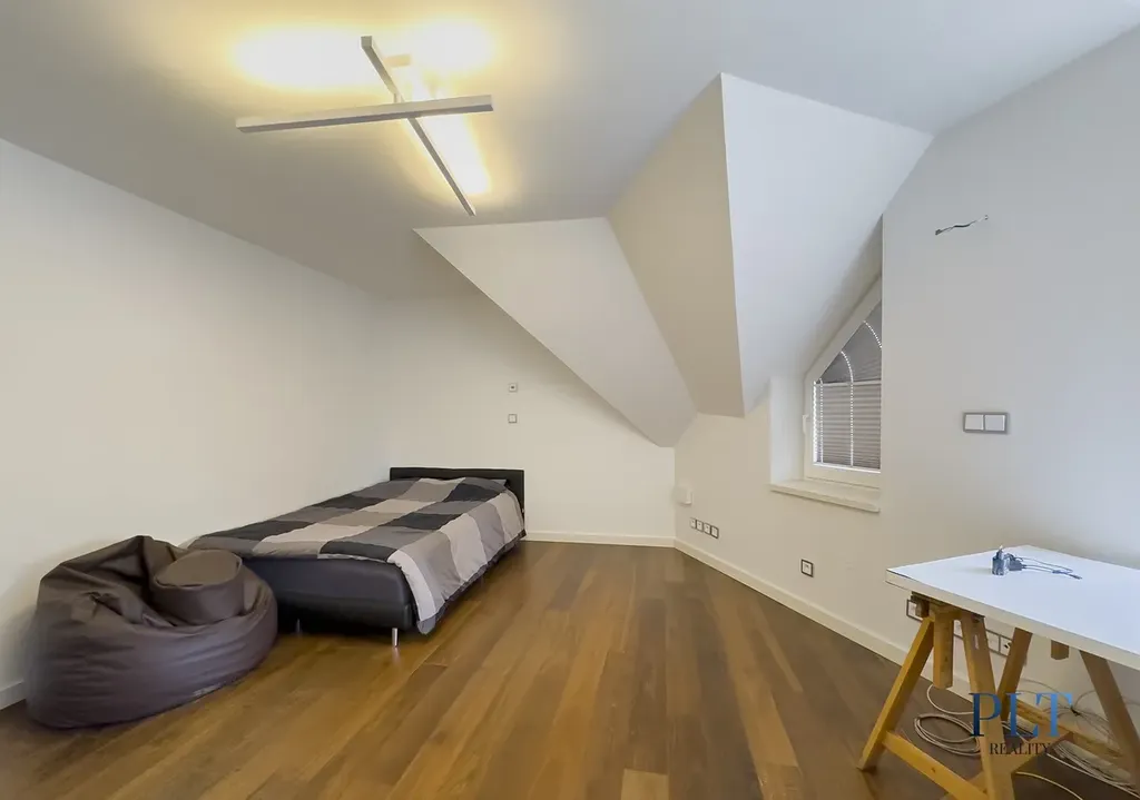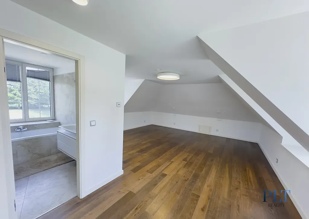 Samostatný byt 3+kk je situován v podkroví nad garáží ve východním křídle domu a nabízí plochu 79 m². Díky oddělenému vstupu je ideální například pro hosty nebo vícegenerační bydlení.