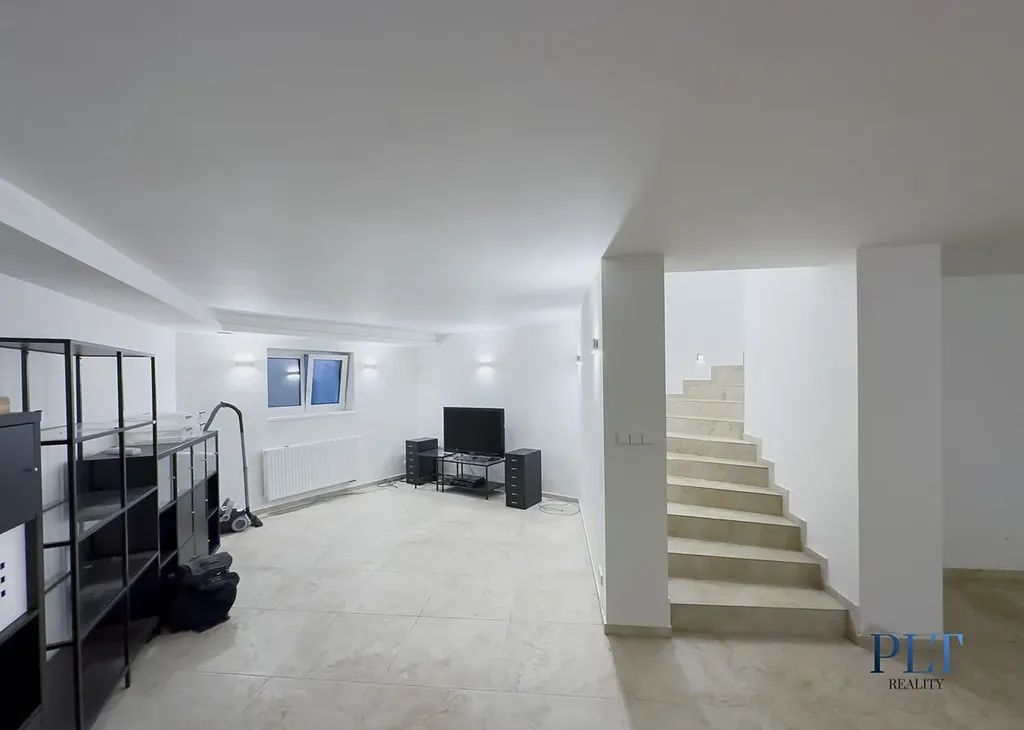 V suterénu domu (1. PP) je k dispozici vinárna s krbem, posilovna, technická místnost, WC a skladové prostory. Užitná plocha tohoto podlaží je 99,5 m².